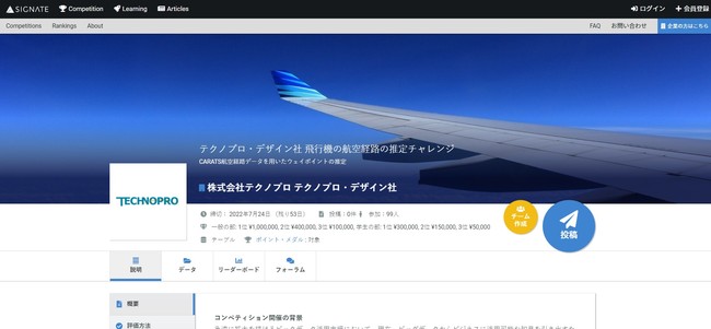 AI開発・運用、DX人材の育成サービスを提供する株式会社SIGNATE(本社:東京都千代田区、代表取締役社長:齊藤 秀、以下 SIGNATE)は、データサイエンスプラットフォーム「SIGNATE(R)」にて、株式会社テクノプロ(本社:東京都港区、代表取締役社長:嶋岡 学)の社内カンパニーであるテクノプロ・デザイン社(以下、「テクノプロ・デザイン社」)主催のコンペティション『テクノプロ・デザイン社 飛行機の航空経路の推定チャレンジ~CARATS航空経路データを用いたウェイポイントの推定~』を、本年6月1日(水)より開催いたします。