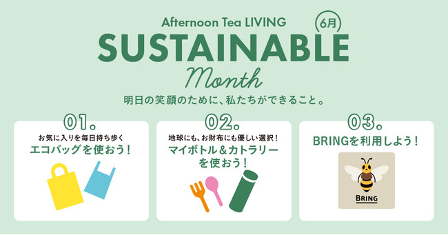 レジ袋の有料化から利用することが増えたエコバッグのご紹介や、使い捨てのものではなく、マイカトラリーやマイボトルを持つことのススメ、さらに限定5店舗にて、衣服を回収し、リユースやリサイクル(服の原料や自動車内装材等に再生)など様々な方法で循環させるBRINGの店頭回収を実施します。「Afternoon Tea LIVING SUSTAINABLE Month」をきっかけに、サステナブルな生活をご提案していきます。