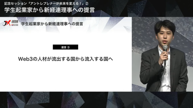 「日本からシンガポールやドバイへ移住している起業家や移住を検討している起業家が多い現状は非常に勿体無い」とし、新経済連盟の理事の方々に対して、Web3の人材が【流出する国】から【流入する国】となるよう、「税制改革に対するより強い働きかけ」と「Web3へのさらなる資金投下」を提言しました。