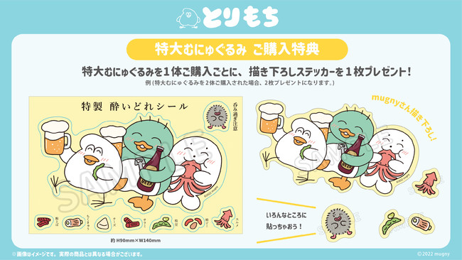 今回とりもち 特大むにゅぐるみをご予約いただいた皆様に なんと!mugnyさん描き下ろしのステッカー「特製 酔いどれシール」をプレゼント!※1体ご購入ごとに、1枚プレゼントいたします。