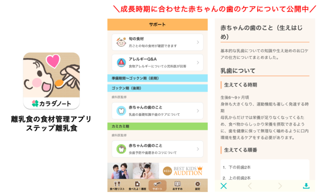 「家族の健康を支え笑顔をふやす」をビジョンとし、家族と向き合う全ての人のアシスタントとして心身ともに健康な生活を支援する事業会社である株式会社カラダノート(東京都港区/代表:佐藤竜也/以下当社)が開発・運営する、離乳食の食材管理アプリ「ステップ離乳食」にて新コンテンツ『赤ちゃんの歯のこと(歯科医監修)』をiOS・Androidの両OSにて公開したことをお知らせいたします。