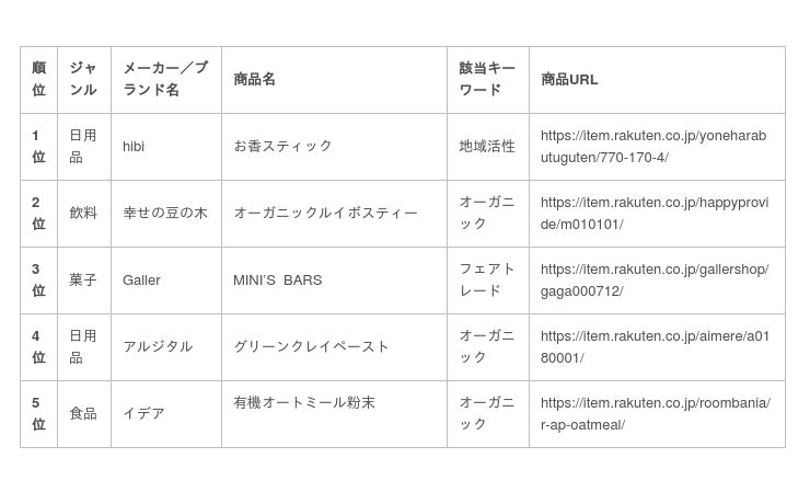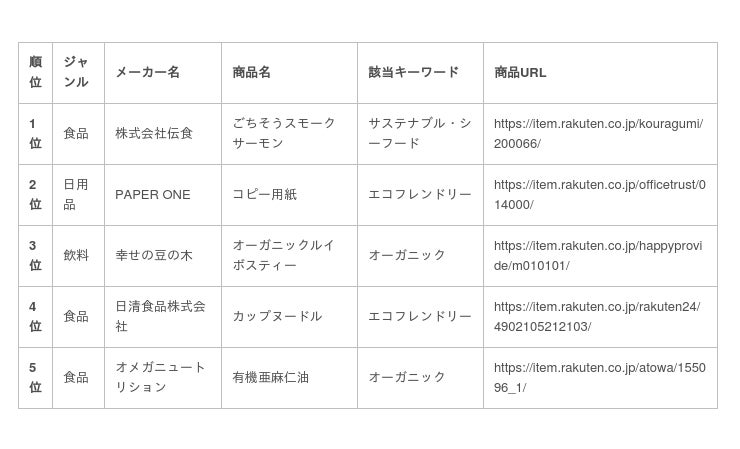 このたび、「Go Green Together」プロジェクトの一環として、6月5日(日)の「世界環境デー」に向けて、「EARTH MALL with Rakuten」で取り扱う、環境や持続可能性に貢献する“グリーン”な商品(注2)の中から、全年代のユーザーを対象とした売れ筋(総合)と、20代のユーザーにおける売れ筋の2つのランキングを発表しました。