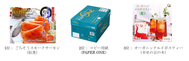 「“グリーン”な商品 売れ筋ランキング(総合)」では、海の自然環境に配慮しながら養殖された「ASC認証」を取得した「ごちそうスモークサーモン」や、農薬や化学肥料などの化学物質に頼らずに生産された「オーガニックルイボスティー」や「有機亜麻仁油」などの有機JAS認証オーガニック食品、森林破壊防止および生物多様性保全などに配慮されて生産・加工された「RSPO認証パーム油」を使用した「カップヌードル」が上位にランクインしました。また、持続可能性に配慮して管理された森林の資源からつくられた「コピー用紙」や、パーム油の生産によって熱帯雨林やそこに生息する生物などに悪影響を与えることのないよう配慮してつくられた「洗たく用せっけん」などの日用品も、ランクインしました。