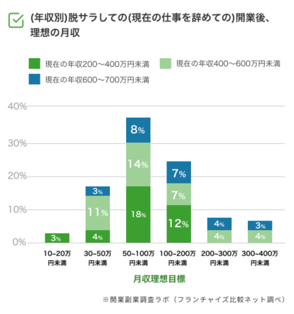 なお、「月収50~100万円未満」を年収換算すると「年収600万~1100万円」となり、40~50代の会社員のうち29.4%の少数派・高収入層にあたります。「200~600万円」の層が70.6%を占めていた現年収データと比較すると、脱サラ後は今以上に大きく稼ぎたいと考えている人が非常に多い結果となりました。