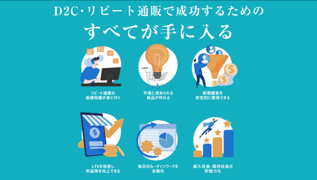 企画 製造 販売 のノウハウを学び、全てお任せで新しく社員を雇わず、たった1商品で億越えの新規事業を創るアカデミーとなっております。D2Cのノウハウを出し惜しむことなく1から解説しております。全6章(約3600分)に及ぶオンライン講座のカリキュラムをご用意。新規参入をご検討の方から、立ち上げてみたもののどう進めて良いか分からない、改善点が分からない、など様々な悩みを一挙に解決致します。