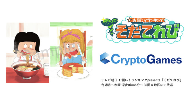ブロックチェーンゲーム、NFTサービスの開発を行う、CryptoGames株式会社(東京都渋谷区、代表取締役:小澤 孝太)は、テレビ朝日で放送中の新番組 お願い!ランキングpresents「そだてれび」内の企画である「エモエフティー やってみた!」と共同で、NFTマーケットプレイス「OpenSea」における漫画家・魚乃目 三太先生の書き下ろし作品「ITADAKIMASU (ramen)」 「ITADAKIMASU (pancake) 」のNFTアートの販売支援を実施したことをお知らせいたします。