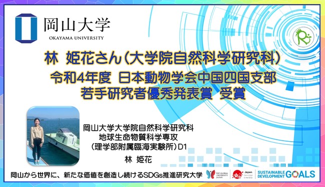 【岡山大学】林姫花さん(大学院自然科学研究科) 令和4年度日本動物学会中国四国支部 若手研究者優秀発表賞を受賞