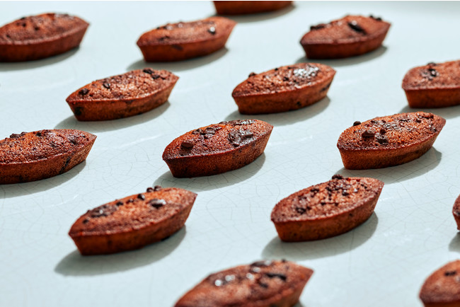 初夏を思わせる涼しげなボートの形をしたカリソンの生地には、華やかな香りのアーモンドプードルとヘーゼルナッツプードルを使用し、コロンビア産の2種のチョコレートをブレンドし、澄ましバターでしっとりと軽やかな食感に仕上げています。メゾンカカオの代名詞でもあるコロンビア産のチョコレートは、火を入れることで香りが一層引き立ち、カカオの魅力を余すところなく味わえる、美味しさの詰まった一品となっています。