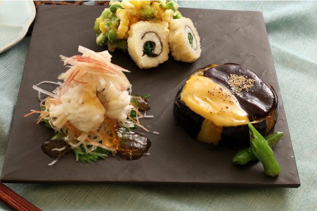 甘いとうもろこしと枝豆をかわいくてまりの形にしたかき揚げと鱧に葱を巻いて揚げた天ぷらを盛り合わせます。