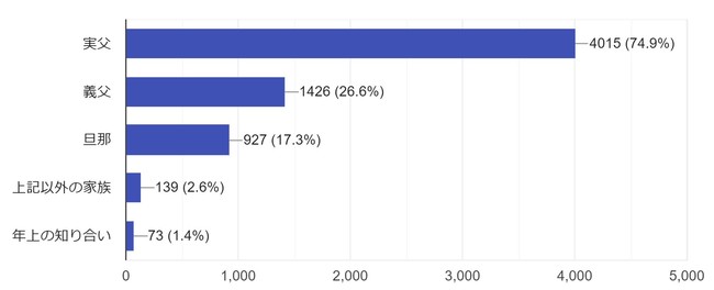 また、「間柄」は「実父」が最も多く74.9%となりました。他にも、「義父」が26.6%、「旦那」が17.3%と多くの声を集めました。