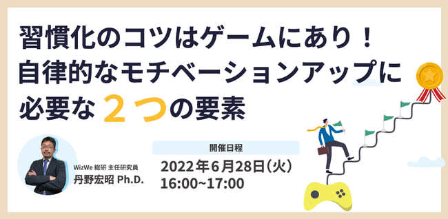 この度、習慣化プラットフォームを開発・運営する株式会社WizWe(ウィズウィー、所在:東京都千代田区、代表取締役CEO:森谷 幸平、以下「WizWe」)は、WizWe総研 主任研究員 丹野宏昭Ph.D.によるセミナー「習慣化のコツはゲームにあり!自律的なモチベーションアップに必要な2つの要素」を、2022年6月28日(火)に開催いたします。