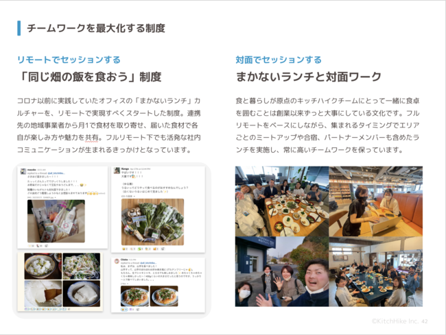 OPEN&GIVEなコミュニケーション精神と、キッチハイクが大切にしてきた「チームで食卓を囲む」ことをオンライン・オフラインでもできる仕組みを取り入れ、チームワークを最大化しています。