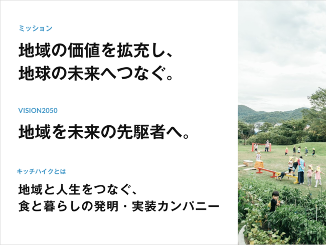 株式会社キッチハイク(本社:東京都台東区、共同代表:山本雅也・藤崎祥見、以下「キッチハイク」)は、ミッション・ビジョン・タグラインを刷新し、新たにVISION2050「地域を未来の先駆者へ。」を設定。新ミッション「地域の価値を拡充し、地球の未来へつなぐ」を掲げ、食のサービスから「食と暮らし」全域への価値提供へ事業領域を拡張し、地域の関係人口経済圏を創出します。コーポレートページ(https://kitchhike.jp/ )をリニューアル、カルチャーデックを公開し、自治体連携と採用を一層強化していきます。