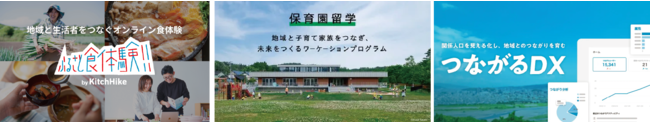 キッチハイクは2013年に食のユーザー向けサービスをスタート。2020年から開始した地域と生活者をつなぐオンライン食体験「ふるさと食体験」を皮切りに、2021年に地域と子育て家族をつなぐ親子ワーケーション「保育園留学」、関係人口を可視化・育成する関係人口特化型SaaS「つながるDX」をリリース。食のサービスから「食と暮らし」全域の自治体向けソリューションへ拡張し、60以上の地域と一緒に未来を実装して参りました。