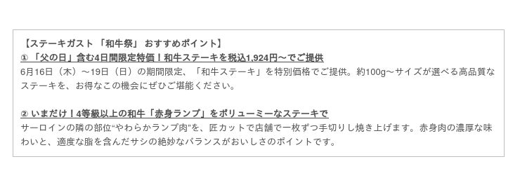 【ステーキガスト】<「父の日」 にはステーキを素敵(ステーキ)な特別価格で>和牛ランプ肉が4日間限定“税込1,924円”~