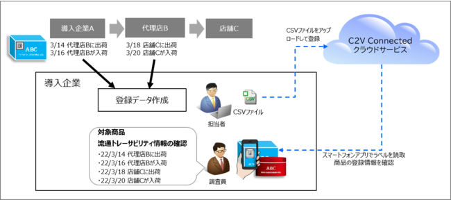導入企業においては、個々の商品にラベルを貼り付ける際、「製品情報登録」機能を利用し、各「ConnectedTag」のIDと紐付けた製造情報を登録できます。「流通トレーサビリティ情報登録」機能を利用し、導入企業・代理店の入出庫情報等流通トレーサビリティ情報を登録できます。導入企業の調査員は、「C2V Connected」のスマートフォンアプリで店頭商品の「ConnectedTag」を読み取り、登録された製造情報および流通トレーサビリティ情報を確認することが可能になります。
