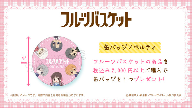 フルーツバスケットの商品を税込み2,000円以上ご購入いただいた方に、缶バッジをお1つプレゼントいたします。ミニキャラたちのかわいいデザイン、是非GETしてください♪
