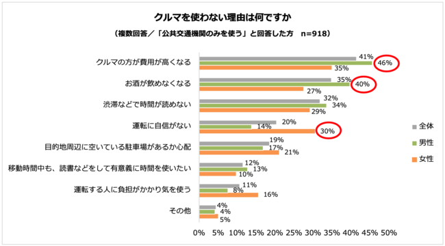 「公共交通機関のみを使う」と回答した人がクルマを使わない理由は「クルマの方が費用が高くなる」が最多で4割を超えました。次いで「お酒が飲めなくなる」、「渋滞などで時間が読めない」という結果になっています。
