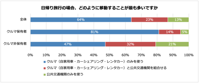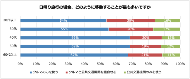 日帰り旅行での移動手段は、「クルマのみを使う」64%がダントツでした。「クルマと公共交通機関を組合せる」は23%、「公共交通機関のみを使う」は13%と、クルマを使う人が8割を超える結果になりました。