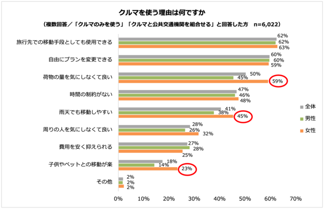 性別で見ると、女性は男性よりも「荷物の量を気にしなくて良い」が10ポイント以上、「雨天でも移動しやすい」「子供やペットとの移動が楽」が5ポイント以上高くなっています。
