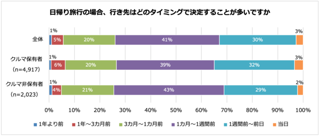 日帰り旅行に行く場合、どのタイミングで行き先を決定するか聞いたところ、「1カ月~1週間前」が最多で41%、2位「1週間前~前日」30%、3位「3カ月~1カ月前」20%となっています。クルマの保有状況別でも傾向に大きな違いはありませんでした。