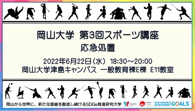 国立大学法人岡山大学(本部:岡山市北区津島中、学長:槇野博史)教育推進機構スポーツ支援室では、スポーツ講座を開催しています。今回、第3回となるスポーツ講座「応急処置」を2022年6月22日(水)に岡山大学津島キャンパス(岡山市北区)にて開催します。