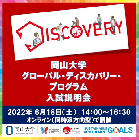 国立大学法人岡山大学(本部:岡山市北区津島中、学長:槇野博史)のグローバル・ディスカバリー・プログラム(GDP)では、高校生・既卒者と保護者・教員の皆様を対象として、2022年6月18日(土)14:00~16:30にオンライン(同時双方向型)での入試説明会を開催します。