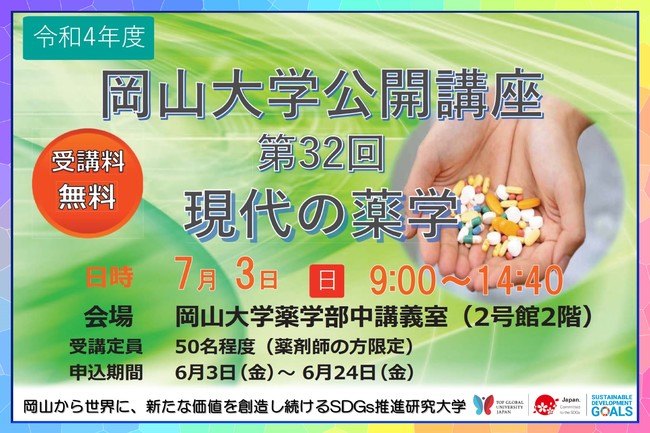 【岡山大学】令和4年度岡山大学公開講座「現代の薬学(第32回)」〔7/3,日 岡山大学津島キャンパス〕