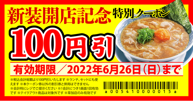 オープン記念として、2022年6月26日(日)まで『丸源ラーメン 草加店』のみでご利用いただける100円引クーポンを配布します。