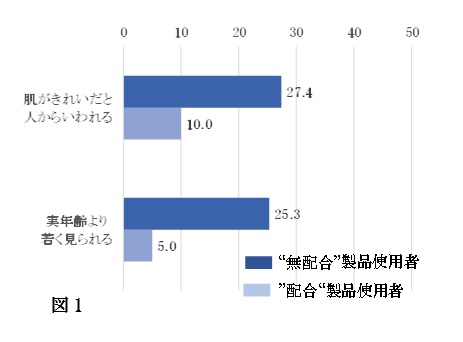肌の負担成分が配合されているスキンケア製品を使用の80人(以下、配合製品使用者群と表記)と、配合されていないスキンケア製品を使用の95人(以下、無配合製品使用者群と表記)で、比較検証をしました。検証項目は、主観的指標として自身の肌への効果実感、客観的指標として肌のキメの状態を設定しました。効果実感は、アンケート調査を実施し、肌のキメとシワは、表面形状採取ができるレプリカ剤を使用して洗顔20分後の頬と目尻の状態を各自で採取してもらい、当研究所に送付後、解析しました。その結果、無配合製品使用者群は、「肌がきれいだと人からいわれる」「実年齢より若く見られる」の項目で、配合製品使用者群と比較してそれぞれ27.4%、25.3%と多い回答があり、有意に主観的での差があることが確認されました(図1)。