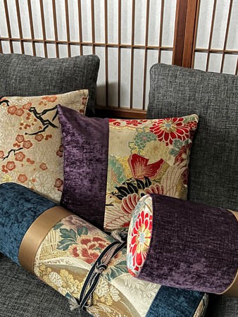 アンティークの着物帯をアップサイクルし、インテリアとしても映えるクッションに