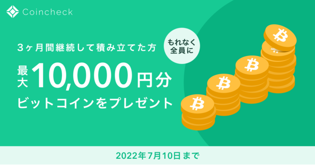 コインチェック株式会社(以下、コインチェック)が提供する暗号資産積立サービス「Coincheckつみたて」では、2022年6月12日より、積立金額に応じて最大1万円相当のBTCがもらえるキャッシュバックキャンペーンを実施いたします。本キャンペーンは、新規のお客様だけでなく、一度「Coincheckつみたて」を退会したお客様や現在積立中のお客様もご利用いただけます。
