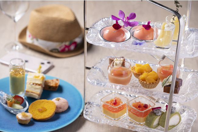 見た目にも涼やかな桃とグアバフルーツのジュレや、チーズクリームがなめらかな桃とフロマージュブランのムースなど、ジューシーな桃を存分にお楽しみいただける夏のメニュー。7月は山梨県の最高級ブランド桃「春日居(かすがい)の桃」、8月上旬からは贈答品にも使われる福島県産の桃と、2種類の桃をセレクトし、時期に合わせた完熟の桃をお楽しみいただけます。桃そのものの美味しさをダイレクトに感じていただけるよう、アフタヌーンティースタイルのウイークデイには、スライスカットでもご提供。オーダービュッフェスタイルのウイークエンドでは、カットしたての桃をタルト生地と合わせた、フレッシュピーチタルトでお召し上がりください。また、ウイークエンド限定で登場する熱々のトロピカルフルーツのソテーには、沖縄県産の塩を使ったアイスクリームを添えました。甘さと塩味の絶妙なコントラストをお楽しみいただけます。