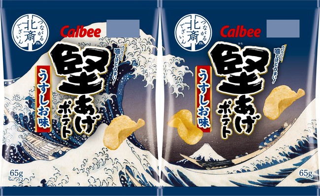 カルビーとすみだ北斎美術館のコラボ第3弾!和の世界観を発信!「堅あげポテト」が北斎名画デザインに!全6種類!“つながる北斎でざいん”の『堅あげポテト うすしお味/ブラックペッパー/焼きのり味』