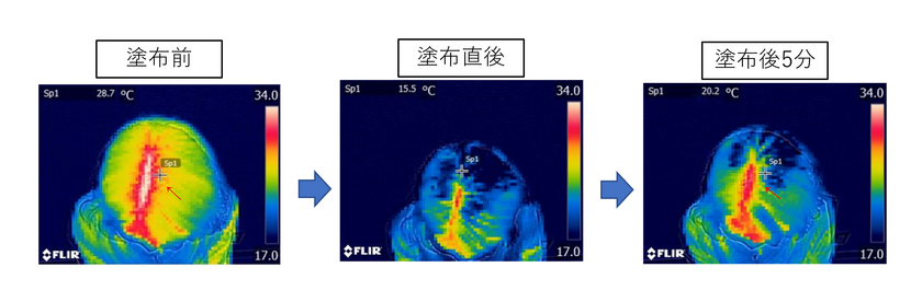また、冷却育毛剤塗布後の温度変化をサーモグラフィにより確認しました。その結果、塗布後5分以上、毛髪・頭皮の温度低下が継続していることがわかりました。