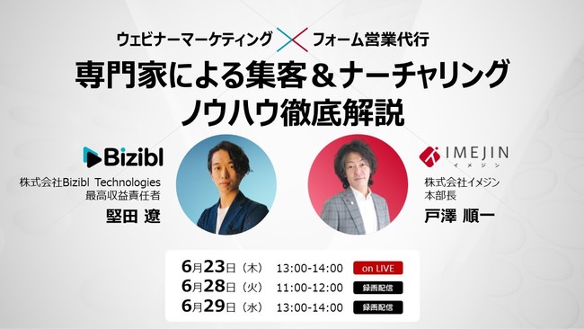 株式会社Bizibl Technologies(本社:大阪市北区、代表取締役:花谷燿平、以下Bizibl)と株式会社イメジン(本社:東京都新宿区、代表取締役:松木友範、以下イメジン)がBtoBのマーケター向けに【『ウェビナー』×『フォーム営業代行』 専門家による集客&ナーチャリングノウハウ徹底解説】と題したウェビナーを6月23,28,29日に連日催いたします。