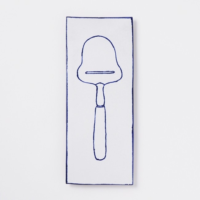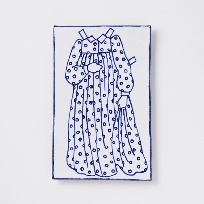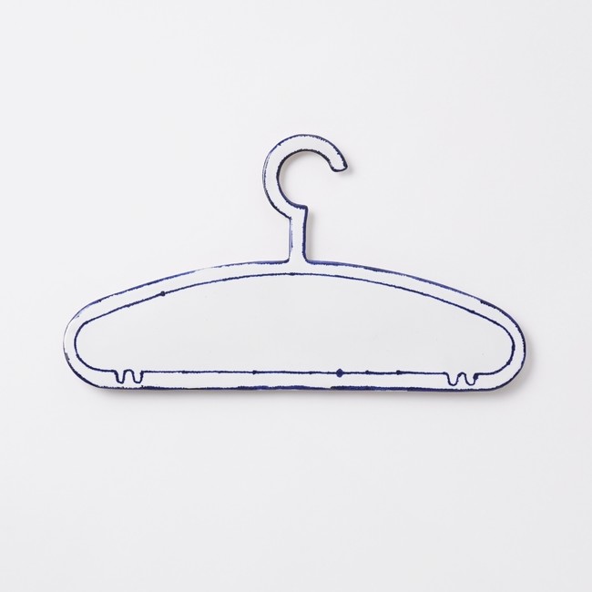日常に普通にあるもの、手で触れる範囲に存在する「あたり前」なものが彼女の創作対象です。平面に描かれたスケッチがまるで意思を持って立ち上がったような立体作品から、だまし絵のような平面作品、言葉のプレートなど多彩。作品の多くは白地にマリアンヌブルーと言われる特徴的なブルーの線で描かれています。