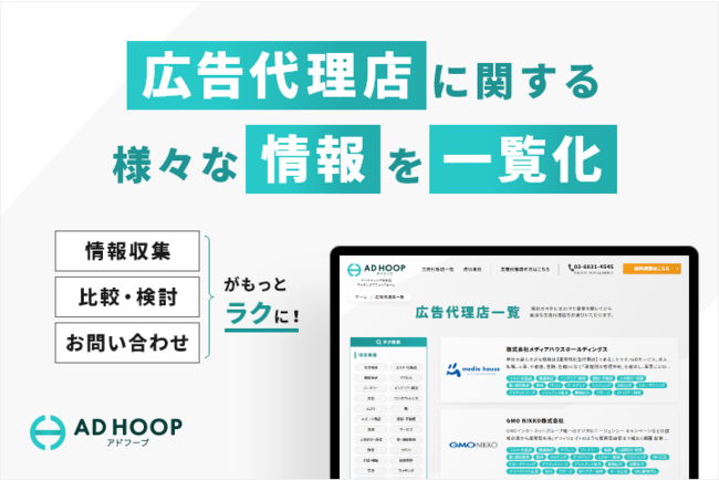 アドフープ、様々な広告代理店情報を集約した一覧ページを公開。希望代理店へのアプローチ機能も追加し、広告代理店探しの効率化を促進