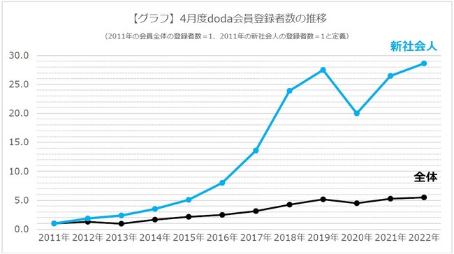 2022年4月に「doda」へ登録した新社会人は、これまでで一番多かった2019年を上回り、本調査を開始した2011年以降、過去最多となりました。また、2011年比で約28倍にまで増加しています。