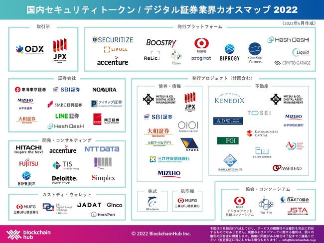 株式会社ブロックチェーンハブ(所在地:東京都中央区、代表取締役:増田剛、以下「弊社」)は、セキュリティトークン(若しくはデジタル証券)ビジネスへのより多くのプレーヤーの参入を促すと共に、日本におけるセキュリティトークンビジネスの現在地を明らかにするべく、「国内セキュリティトークン / デジタル証券業界カオスマップ 2022」を公開しました。