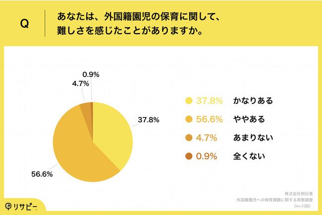 実際に、当社が外国籍園児を保育した経験がある保育士106名を対象に行った調査(※2)によれば、保育士の94.4%が、外国籍園児への保育に難しさを感じています。