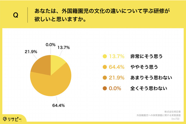 一方で、約7割が、外国籍園児の文化の違いについて学ぶ研修への参加経験がないと回答しており、そのうち約8割が研修を求めている実態が明らかになっています。