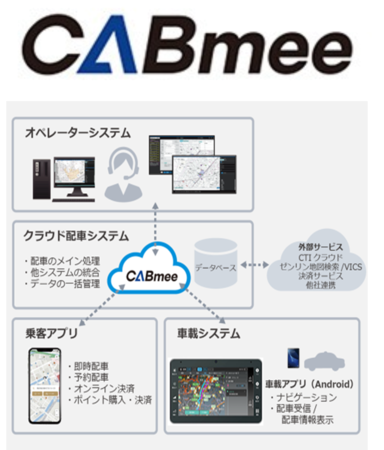 「CABmee」は、クラウドを介してオペレーターシステム、車載システム、乗客のアプリが連動しており、クラウド上でのデータベース管理や地図・ナビなどとの連携が簡単に実現できる発展性や柔軟性が強みとなっています。