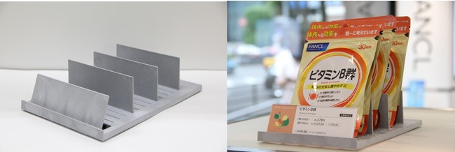 これまでサプリメント陳列什器は、アクリル樹脂を使用していましたが、「MAPKA(R)」を使用した環境配慮型の什器を採用します。「MAPKA(R)」は、株式会社環境経営総合研究所が提供する新しい素材です。プラスチック原料に微細な紙パウダーを混成させて作るので、成形後の収縮性の低さや成型までの時間、その高い剛性および耐熱性から、工業用材料として幅広く活用されています。また、紙パウダーを51%含有しているため、容器包装や成形品と同様に紙製品扱いとなるため、燃えるごみ・燃やすごみとしての廃棄が可能となります(廃棄方法は各自治体基準に準じます)。