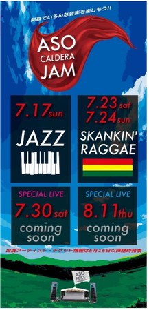 期間中、週末ごとにジャンルを替えて開催されるミュージック・フェスティバル「ASO CALDERA JAM」。7月17日(日)の「ASO JAZZ」には、熊本県出身の歌手・八代亜紀氏がジャズバンドを引き連れて参加。青木カレン&友田ジュンDUOも出演。壮大な阿蘇をバックに、ここでしか見られない野外ジャズイベントが開催されます。