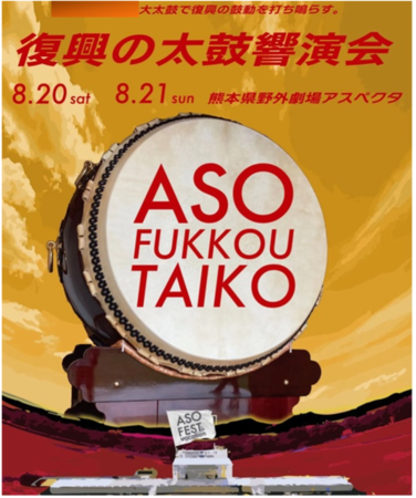 九州各地の太鼓打ちが南阿蘇村・熊本県野外劇場アスペクタに大集結。直径2mを超える大太鼓も登場。直径2mを超える大太鼓も登場。復興を祈り、新たに作曲された『大地の響き』を太鼓奏者が合同で演奏します。8月20日(土)は午後から、21日(日)は終日、力強いパフォーマンスを繰り広げます。