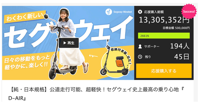 フル日本仕様のセグウェイ電動キックスクーター「D-AIR」Makuakeでの応援購入総額1,300万円突破!