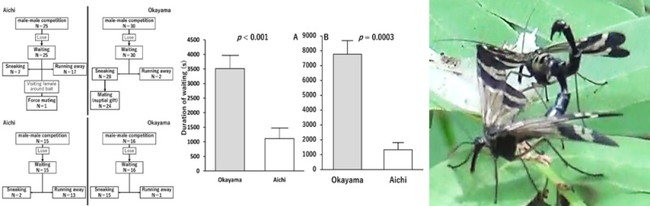 国立大学法人岡山大学(本部:岡山市北区津島中、学長:槇野博史)農学部の石原凌特別教育・研究員と学術研究院環境生命科学学域の宮竹貴久教授は、プロポーズするときオスがメスにプレゼントを示して求愛するヤマトシリアゲについて、愛知と岡山の集団でオスの求愛行動が異なることを発見しました。