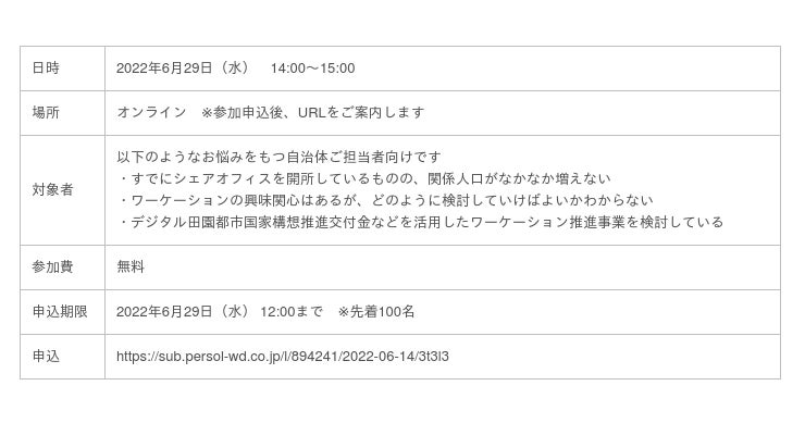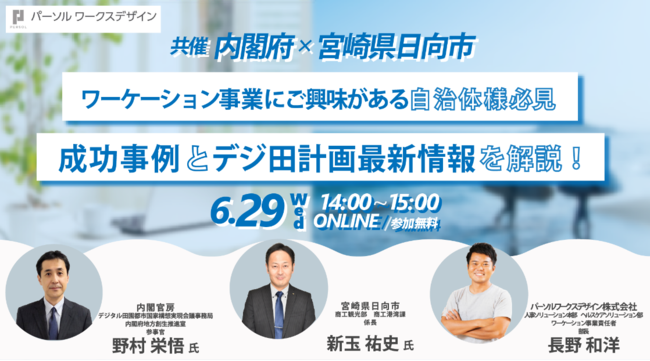 総合人材サービスのパーソルグループで、BPO、ヘルプデスク/コールセンターのアウトソーシングなどを手掛けるパーソルワークスデザイン株式会社(本社:東京都豊島区、代表取締役社長:平林 由義、以下パーソルワークスデザイン)は、自治体ご担当者さま向けに、内閣府および宮崎県日向市と共同でワーケーション事業の成功事例とデジタル田園都市国家構想推進交付金 地方創生テレワークタイプ(デジ田)の最新動向についてお伝えするウェビナーを開催します。