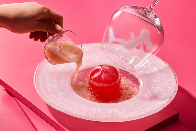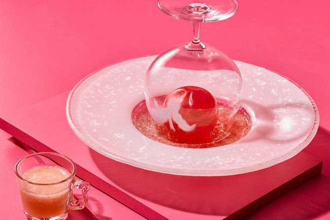 注目はウェルカムデセール。桃の形をした飴の中には、桃のエスプーマ、桃のソルベと桃の果実が。華やかな桃の味わいを、どうぞご堪能ください。また、カフェラテや和紅茶など20種以上のドリンクをフリーフローでお楽しみいただけます。